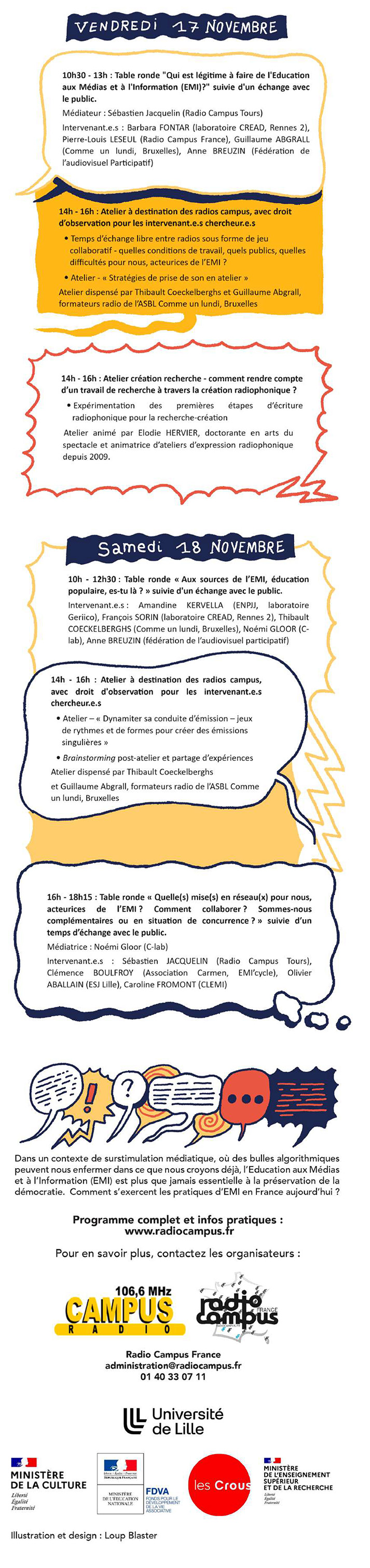 En Nov. 2023 à Lille, Radio Campus France organisait un cycle de rencontres et ateliers avec celles et ceux qui, sur le terrain, agisssent en faveur de l'Education aux Médias et à l'Information (EMI). Chercheur.euse.s, médias associatifs, acteur.ice.s de l'éducation populaire et représentant.e.s institutionels échangeaient durant des jours de tables rondes et d'ateliers autour des enjeux de l'EMI.